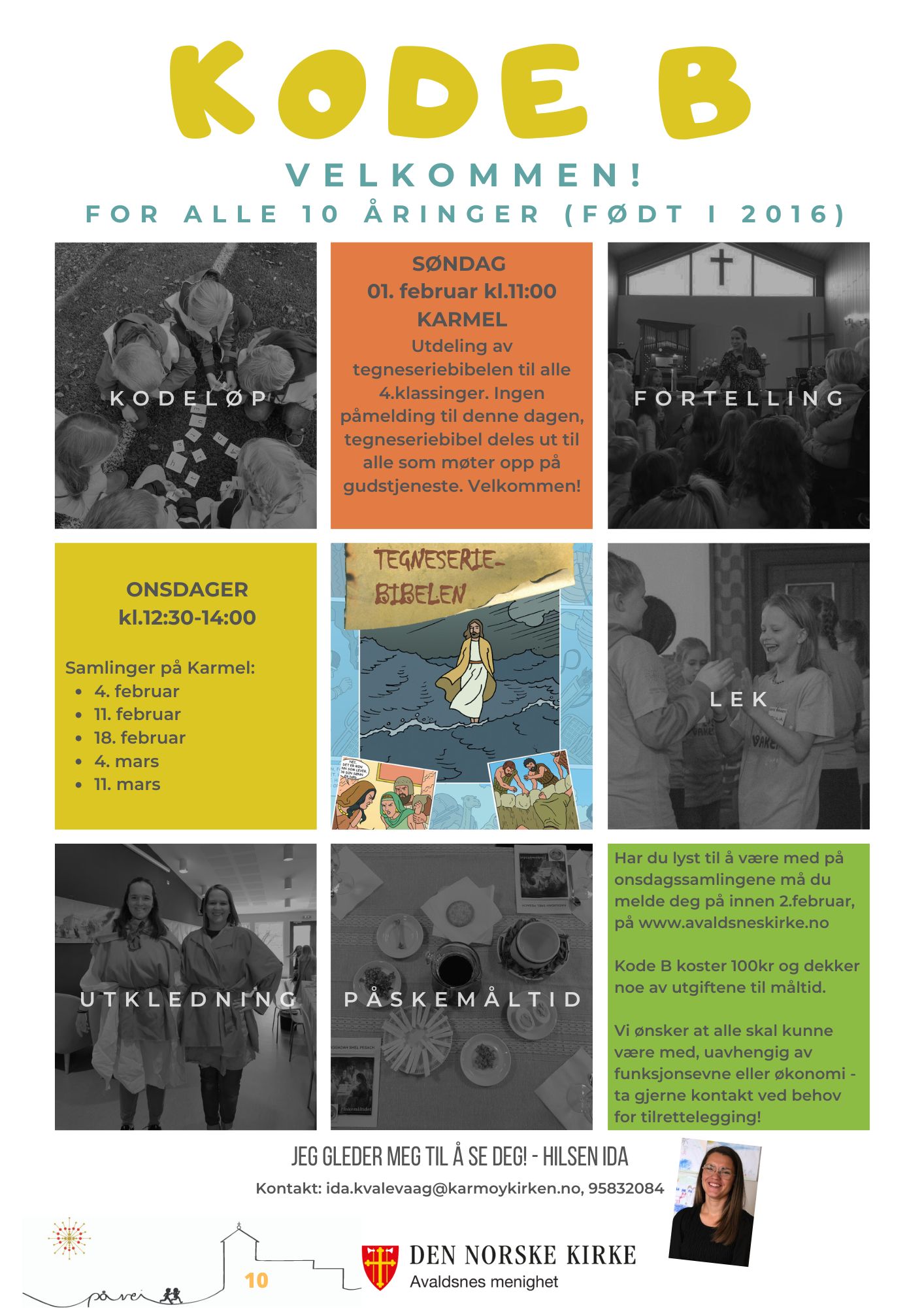 Søndag 1. februar skal alle som blir 10 år i 2026 få tegneseriebibelen i gave fra Avaldsnes menighet. Velkommen til hele familien! Uka etter starter vi opp med Kode B på onsdager, her skal 4.klassingene få mulighet til å utforske Bibelen gjennom kodeløsing, leker og aktiviteter.