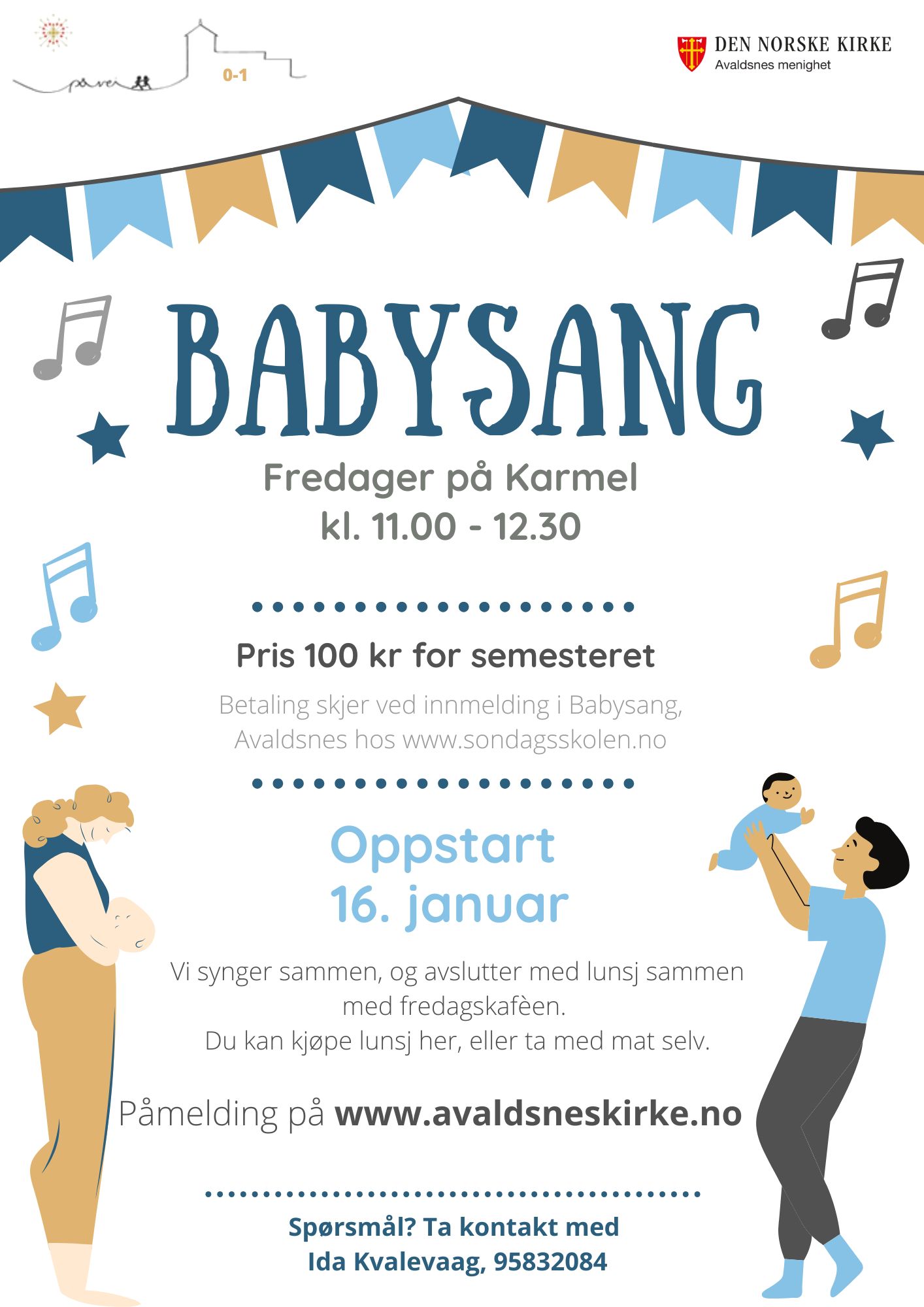For at babysang skal ha så lav pris som mulig, er vi meldt inn i Søndagsskolen Norge. Dere må selv inn å registrer dere og betale for at vi skal får frifondsmidler til å drive et rimelig tilbud. Gå inn på sondagsskolen.no, trykk på bli medlem, og velg "Babysang Avaldsnes" under gruppe. Du betaler 100 kr med vipps når du registrere deg. Dette dekker babysang for deg og ditt barn i 2026.