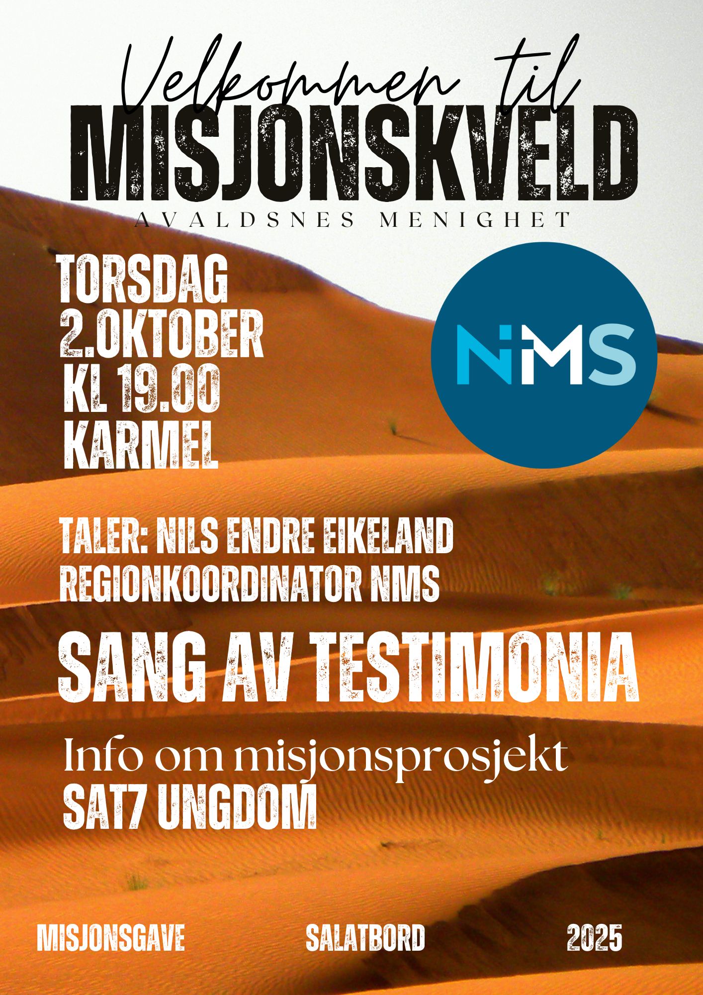 Vi får besøk av Nils Endre Eikeland som er regionskoordinator i NMS. Det blir også informasjon om menighetens misjonsprosjekt i Midt-Østen SAT7 Ungdom.