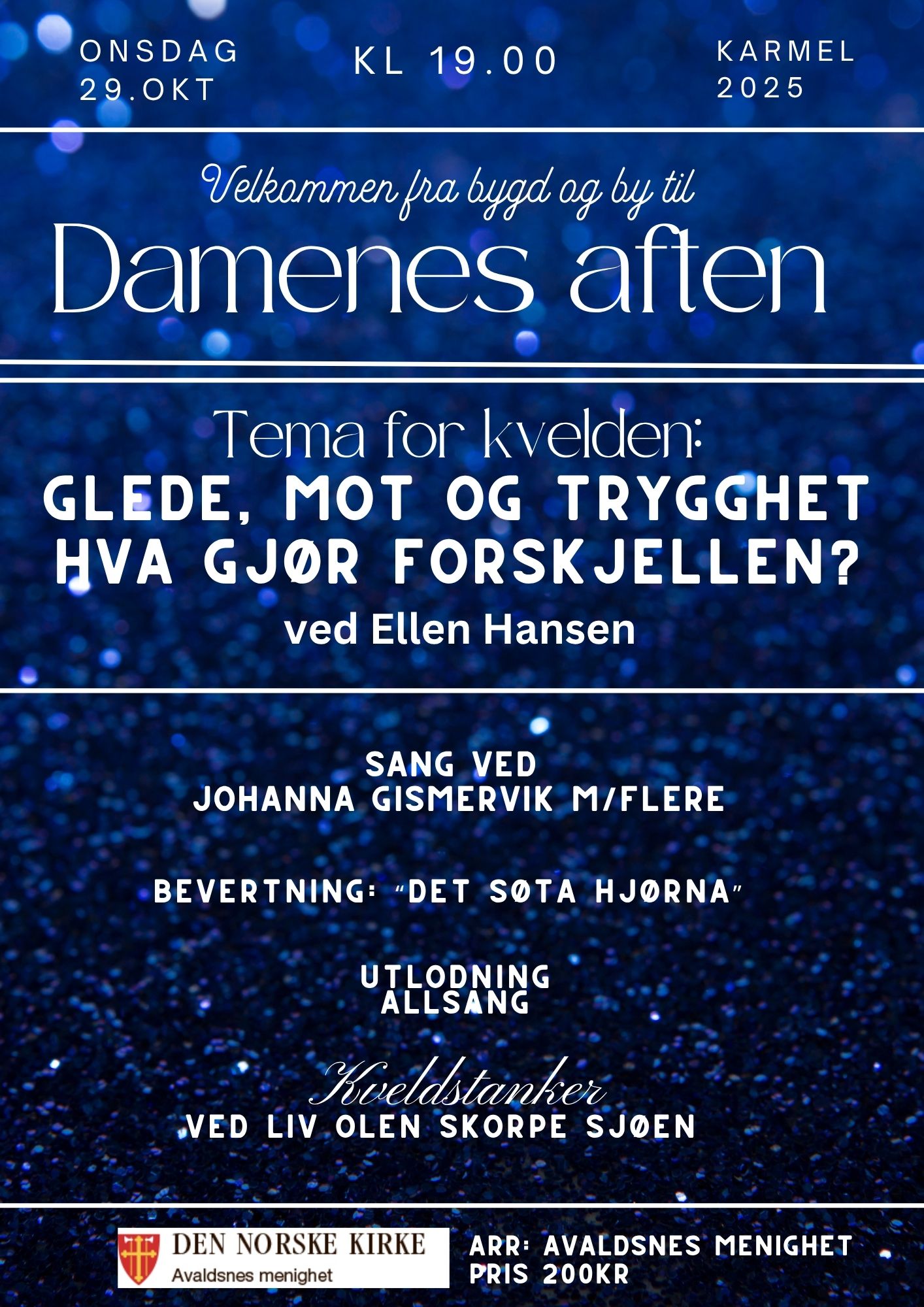 29. oktober er det igjen duket for damenes aften på Karmel kl. 19.00