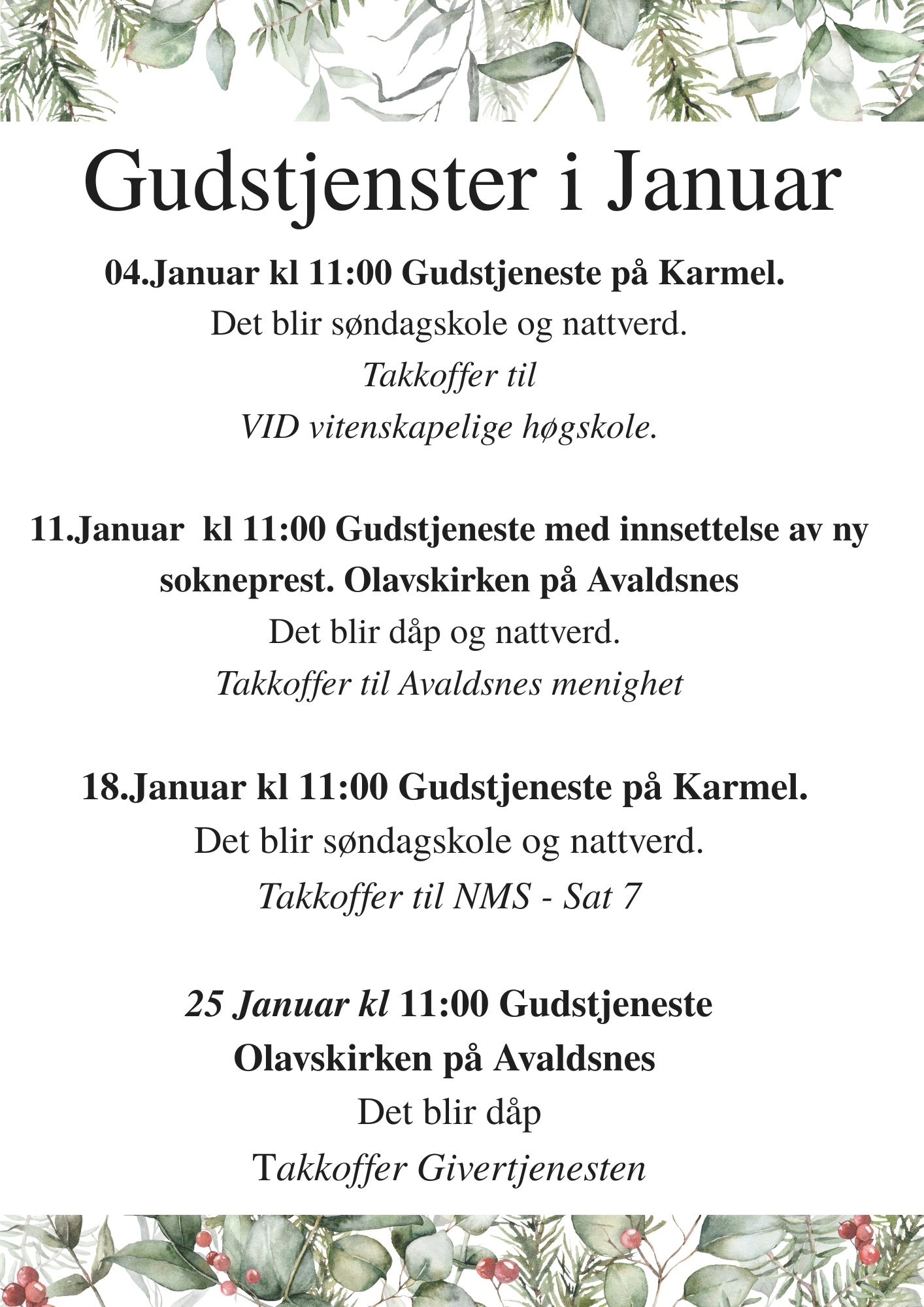 Velkommen til gudstjenster i januar. Her kommer en oversikt, vel møtt!