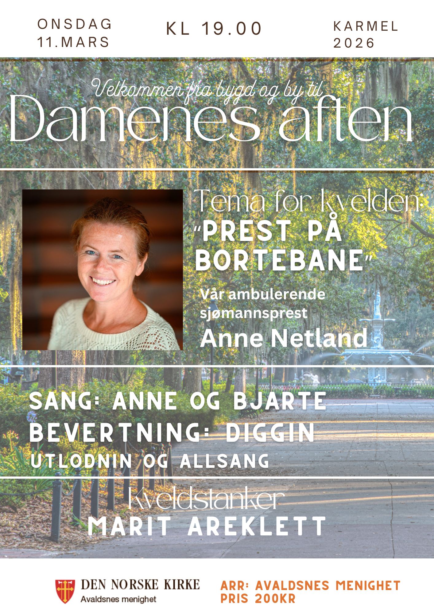 Damenes aften på Karmel 11.mars kl. 19.00. Velkommen fra bygd og by!